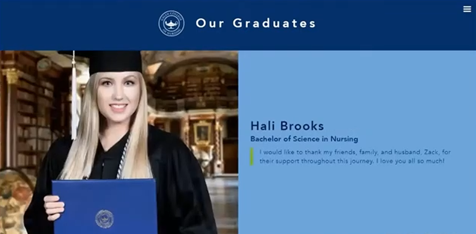 I also led Galen's Virtual Graduation cross-nation team (five campuses) to deliver a virtual graduation experience during the COVID pandemic. I created a dynamic responsive website with a CMS for each of the five campuses featuring all of the graduates, their photos, their personal messages, and their graduate degrees. This site was used to simulate their walk across the stage when receiving their diplomas.